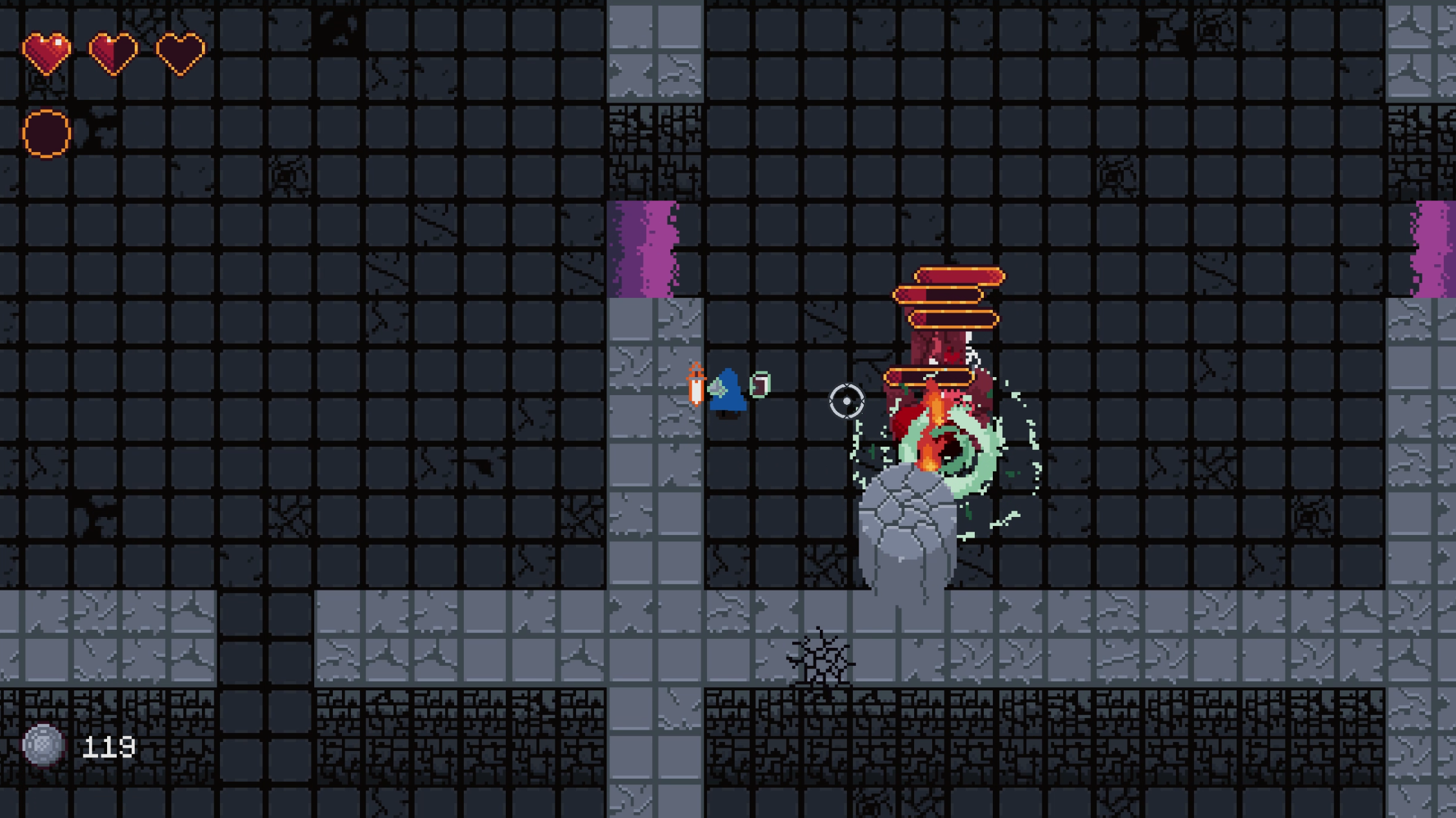The game is an action roguelite (no meta progression right at this moment), with procedural level generation. The main game loop is trying different elemental gems, which alter how your weapon, armour and spells behave! I encourage you to try as many builds as you can to find what you enjoy.